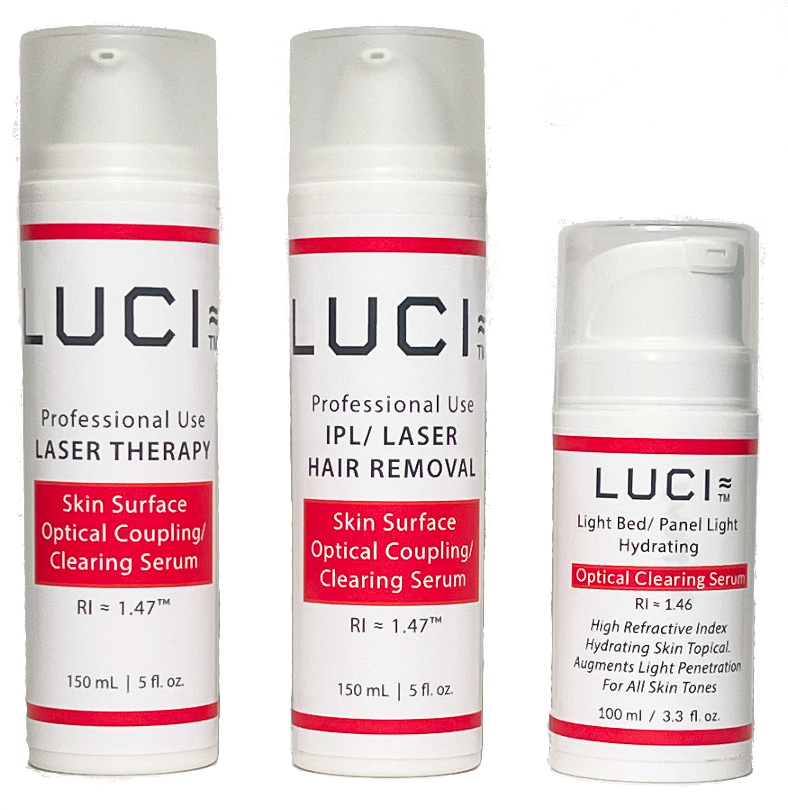 LUCI≈ Anhydrous plant-based high refractive index (RI) topicals clarify the skin surface to augment light penetration into deeper tissues regardless of skin tone. LUCI≈ topicals are skin friendly, noncomedogenic, non-sensitizing, hypoallergenic and preservative free.